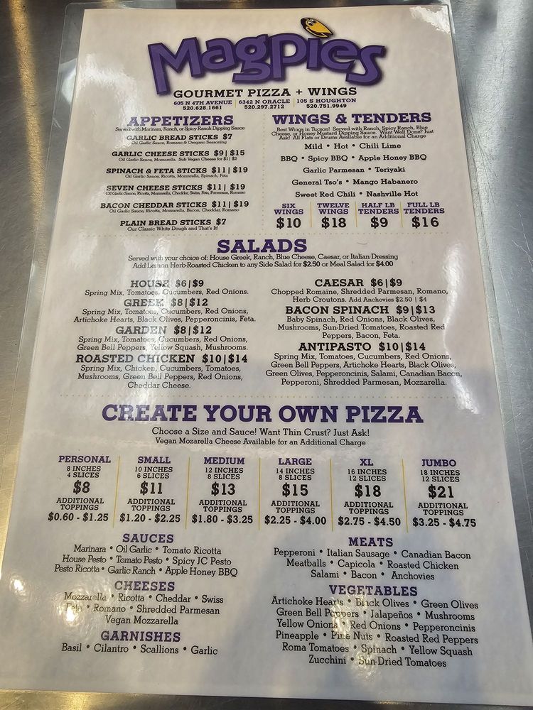 Magpies Gourmet Pizza, located in Tucson, AZ, offers a delightful selection of gourmet pizzas that cater to various tastes and preferences. The menu includes unique creations such as the fiery "Chicken Picante" with lemon herb roasted chicken and jalapenos, and the traditional "Godfather" with Italian sausage and capicola. Customers rave about the quality of the toppings and the friendly service received at Magpies. The cozy ambiance and excellent customer service make dining here a pleasant experience. With options for vegetarian, gluten-free, and lunch specials, Magpies Gourmet Pizza is a hidden gem for pizza lovers looking for a local, authentic dining experience.